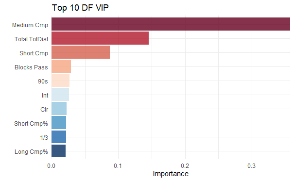 In general, the largest indicator of SPI were the player passing rates. For Midfielders and Defenders, short and medium passes completed respectively were key indicators of SPI. Looking at the non-passing completed variables, Midfielders prioritized passes completed to the 18-yard box while Defenders prioritized total distance passed and blocked passes.