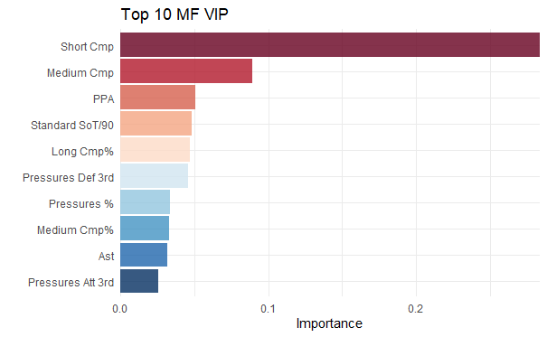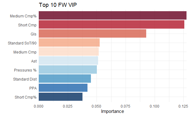 However, for Fowards no one clear variable stood out. The variable importance declined more gradually, with goals, assists, pressures and shots on target being key variables along with the normal passing ones. Intuitively, this is because each team would have a primary striker that is supported by the other forwards.
