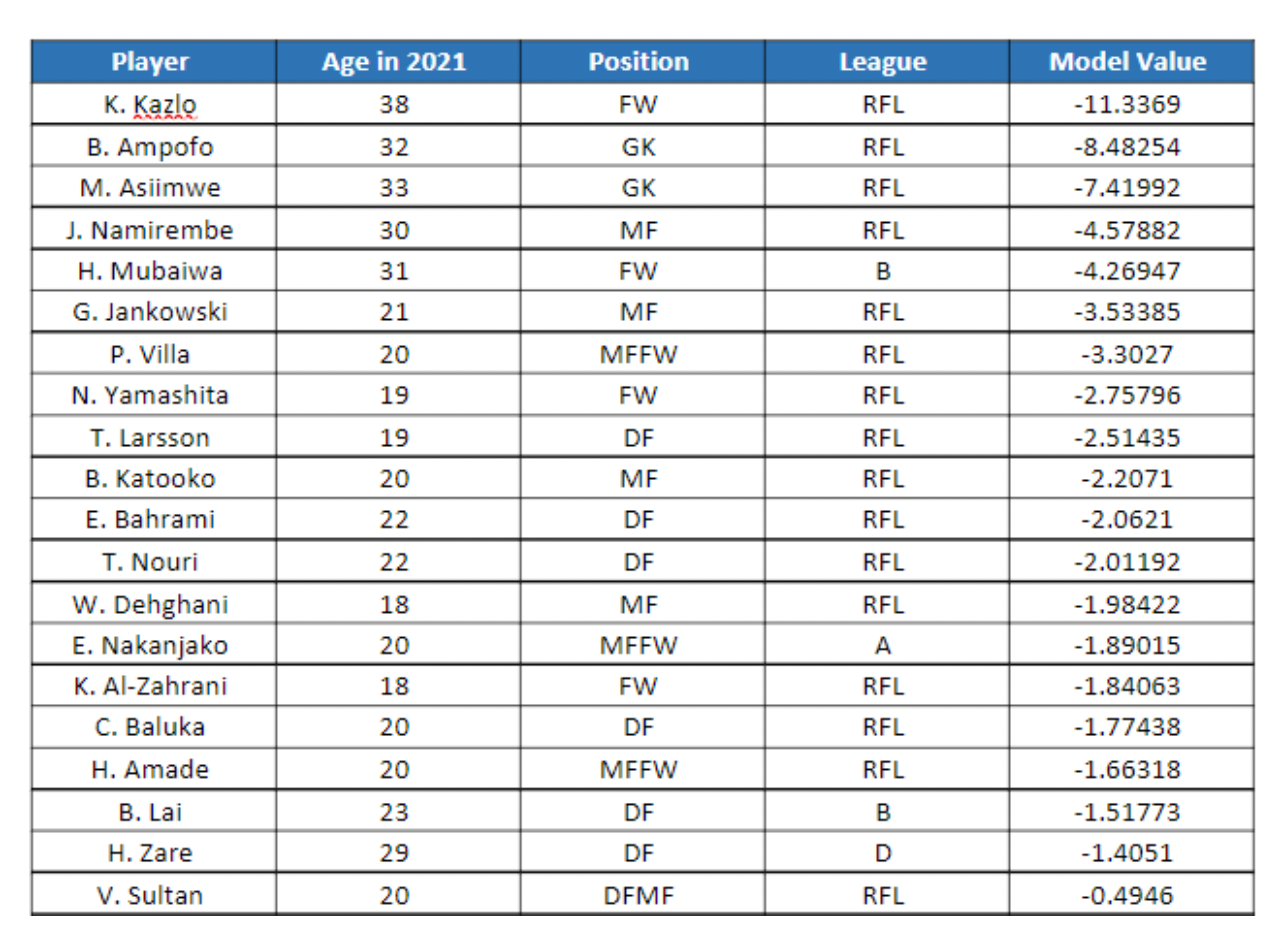Twenty players have been selected from the model output, according to age, position, and league, as seen below. The first eighteen constitute the main team and substitutes, and the last two may be assigned once a player retires.