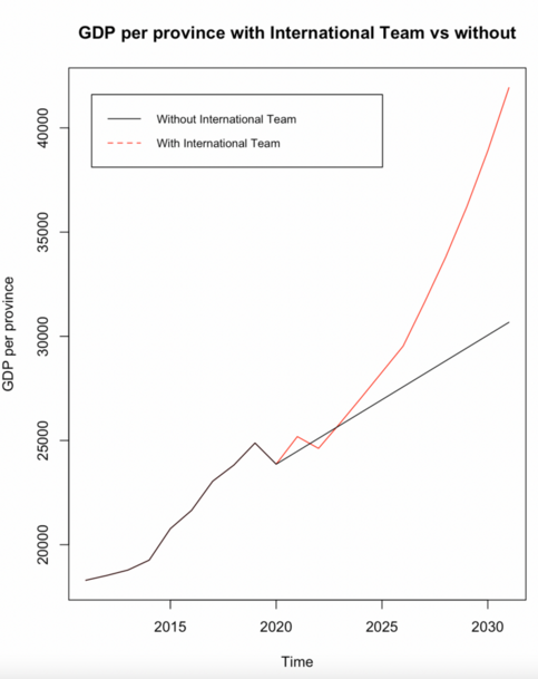 The output produced is visualised in the following graph, depicting that in the long term the introduction of an International Football team will lead to an increase in GDP.