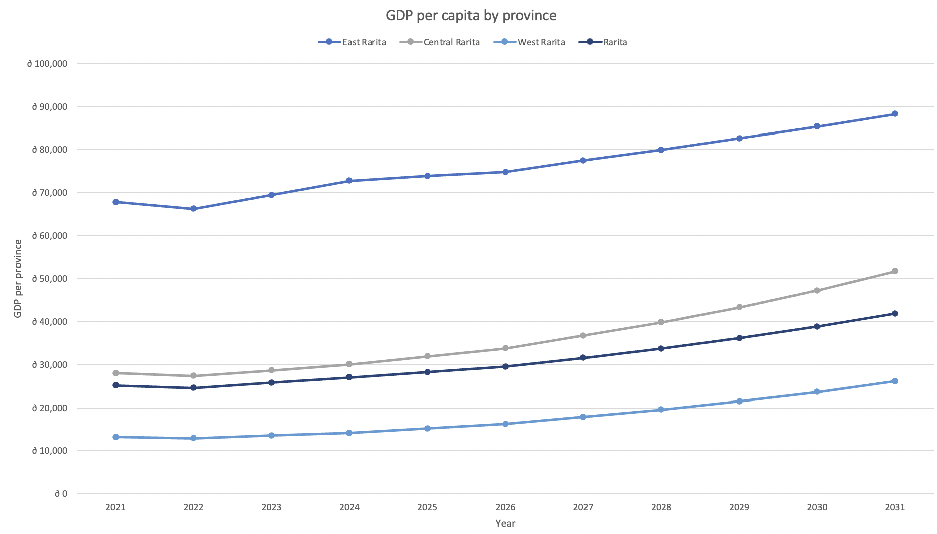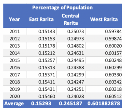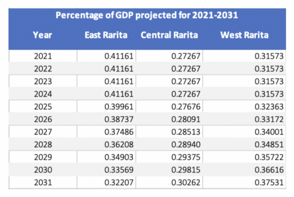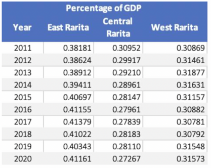 4) To calculate the total GDP of Rarita from 2021-2031 the forecasted population was multiplied with the predicted GDP per capita. The next step was to determine the percentage of GDP attributable to each province from 2021-2031. The percentage of total GDP for each province was calculated for 2011-2020. It can be seen in the table below that East Rarita’s percentage of total GDP was increasing at the highest rate, followed by West Rarita, with Central Rarita’s percentage of GDP decreasing.