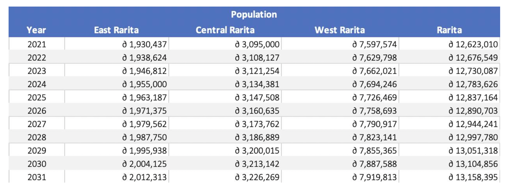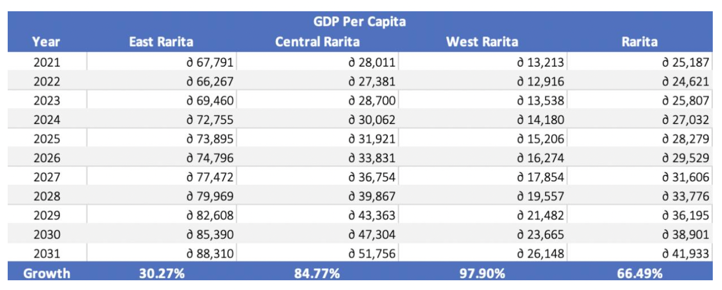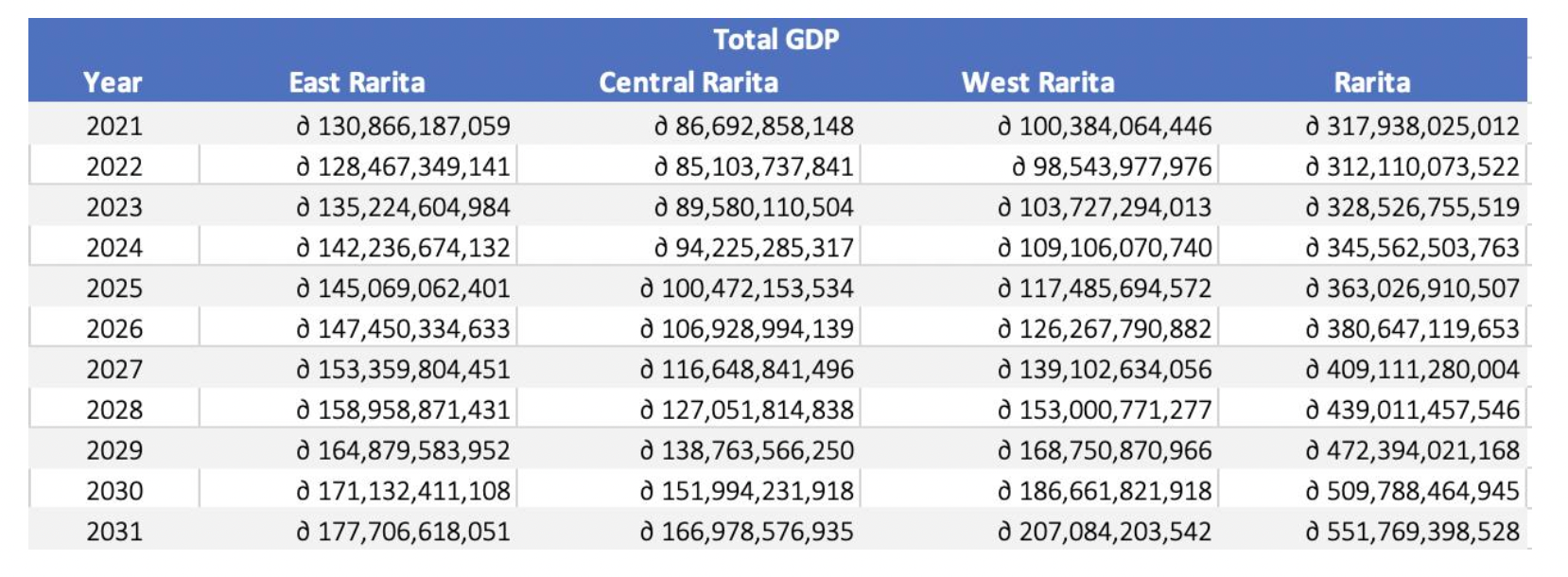 5) As our implementation plan has a focus on decreasing the wealth gap between the provinces, percentage of total GDP per province for 2021-2031 was calculated in accordance. It was assumed that from 2021-2024 the percentage of GDP per province would remain that same as it did in 2020. This is because these years mark the infancy of our newly formed International Team, whilst soccer revenues remained low. However, from 2025-2031 the percentage of total GDP in Central Rarita was assumed to grow at a rate of 1.5% p.a. and the percentage of total GDP in West Rarita was assumed to grow at a rate of 2.5% p.a.