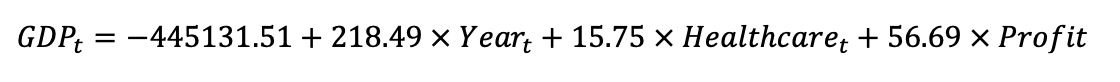 The impact of the implementation plan on GDP was modelled through a linear regression using Year, Household Savings and Profit as predictors. Healthcare was forecasted using an ARIMA (0,1,0) model with drift, while revenue and expenses were forecasted according to benchmark countries as discussed above. Profit was then derived from revnue and expenses. The following regression model was used: