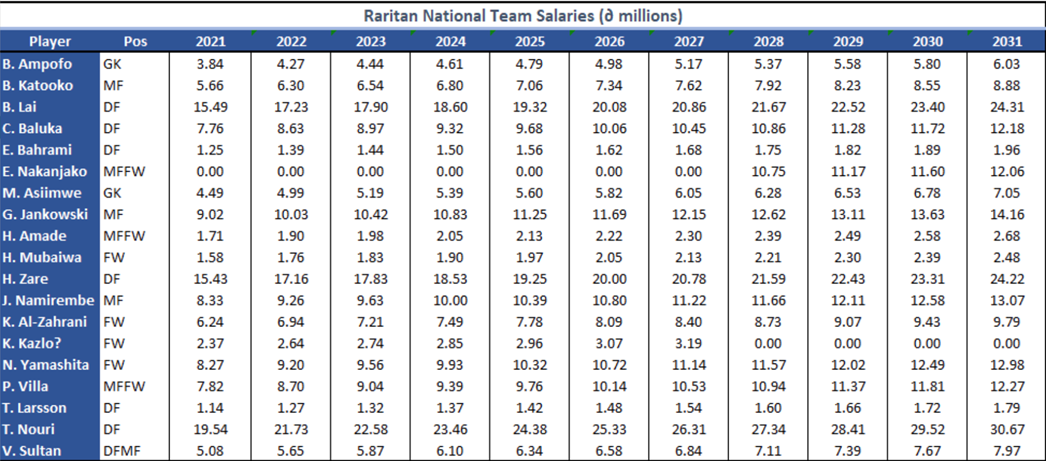 Since only a handful of Raritan players are part of the national team, it’s an opportunity to showcase other under-utilised players, assuming their guaranteed acceptance into borrowing teams. Loans can be up to 2 years per player, and the lending revenue is projected as follows: